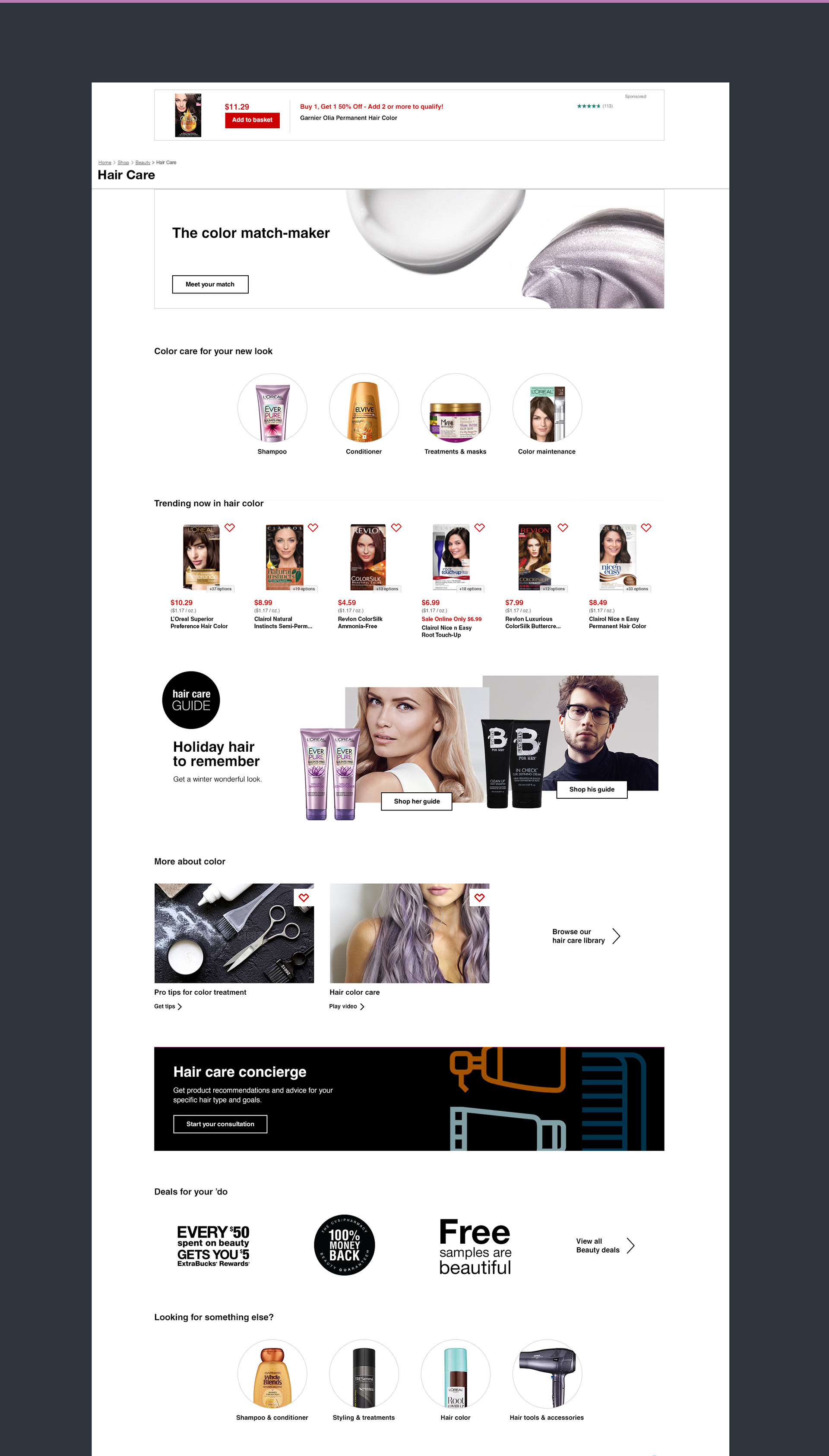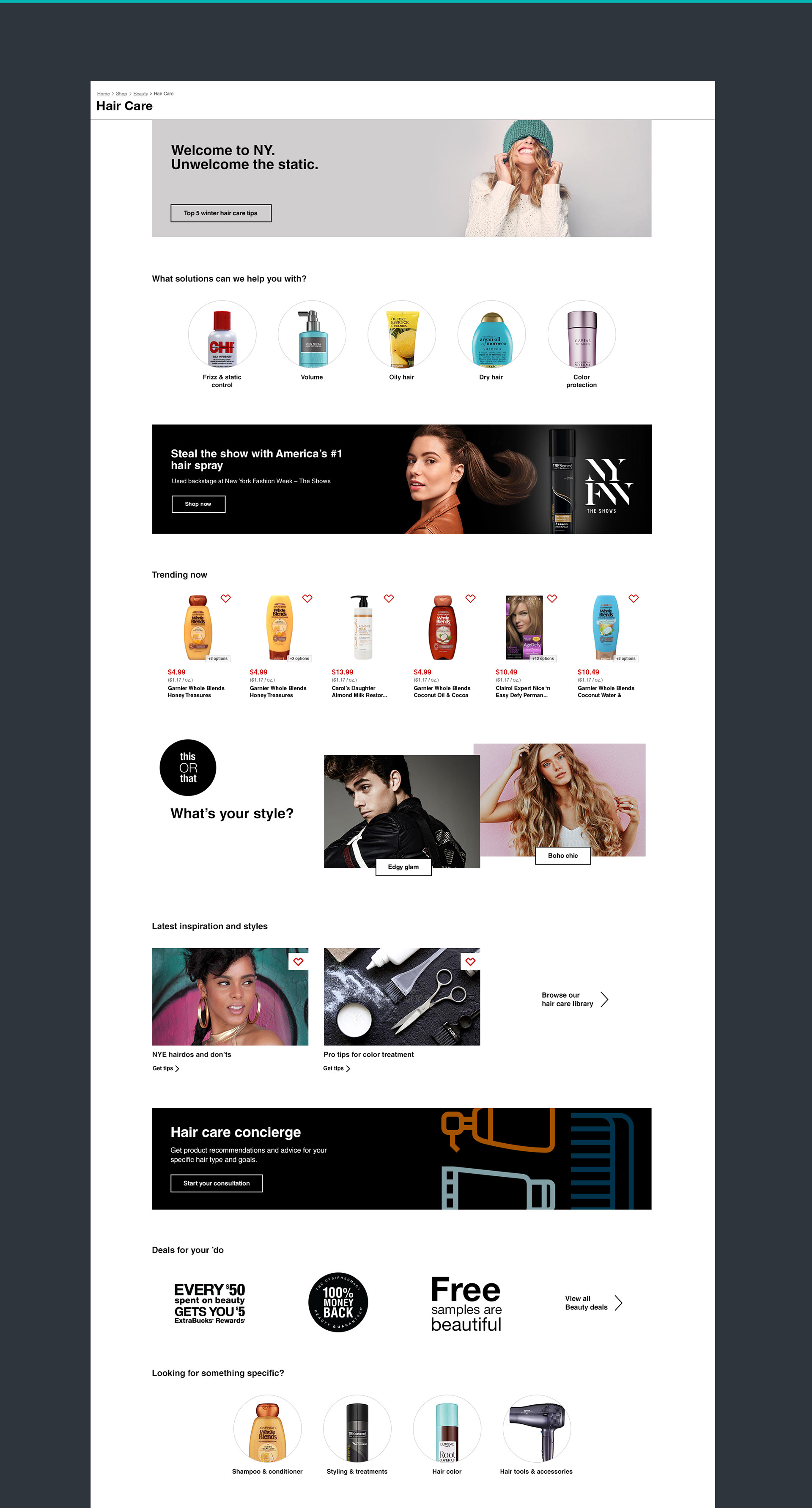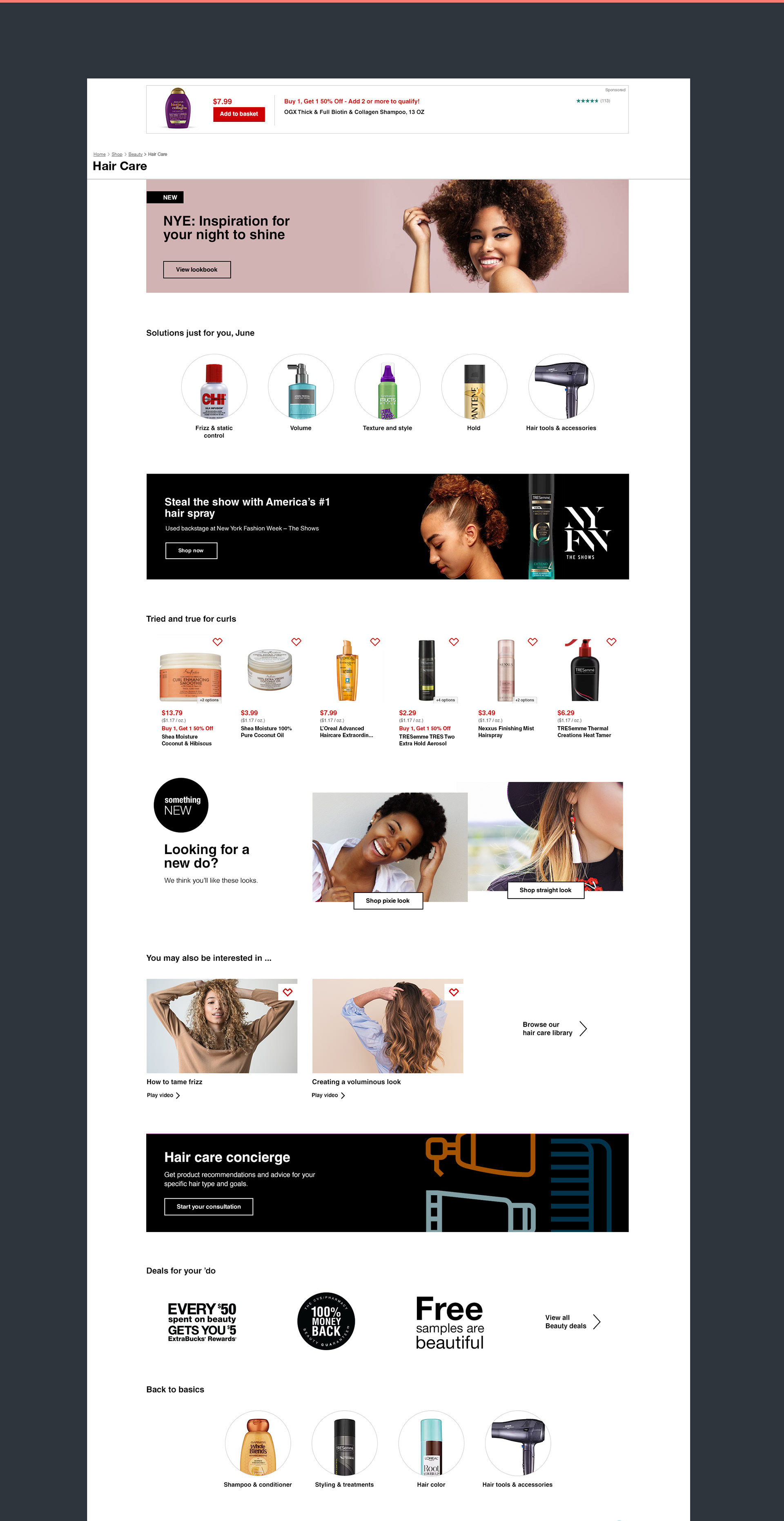 June is a frequent shopper and rewards user on the site. She is currently logged in and, based on past engagement and purchase insights, we see she’s into trends and very likely has curly hair. We want to leverage this first-party user data to provide June with quick, personalized options based on her activity and purchase history. We also left the door open for her to explore other products and interests through standard sub-category links and minimal evergreen content.