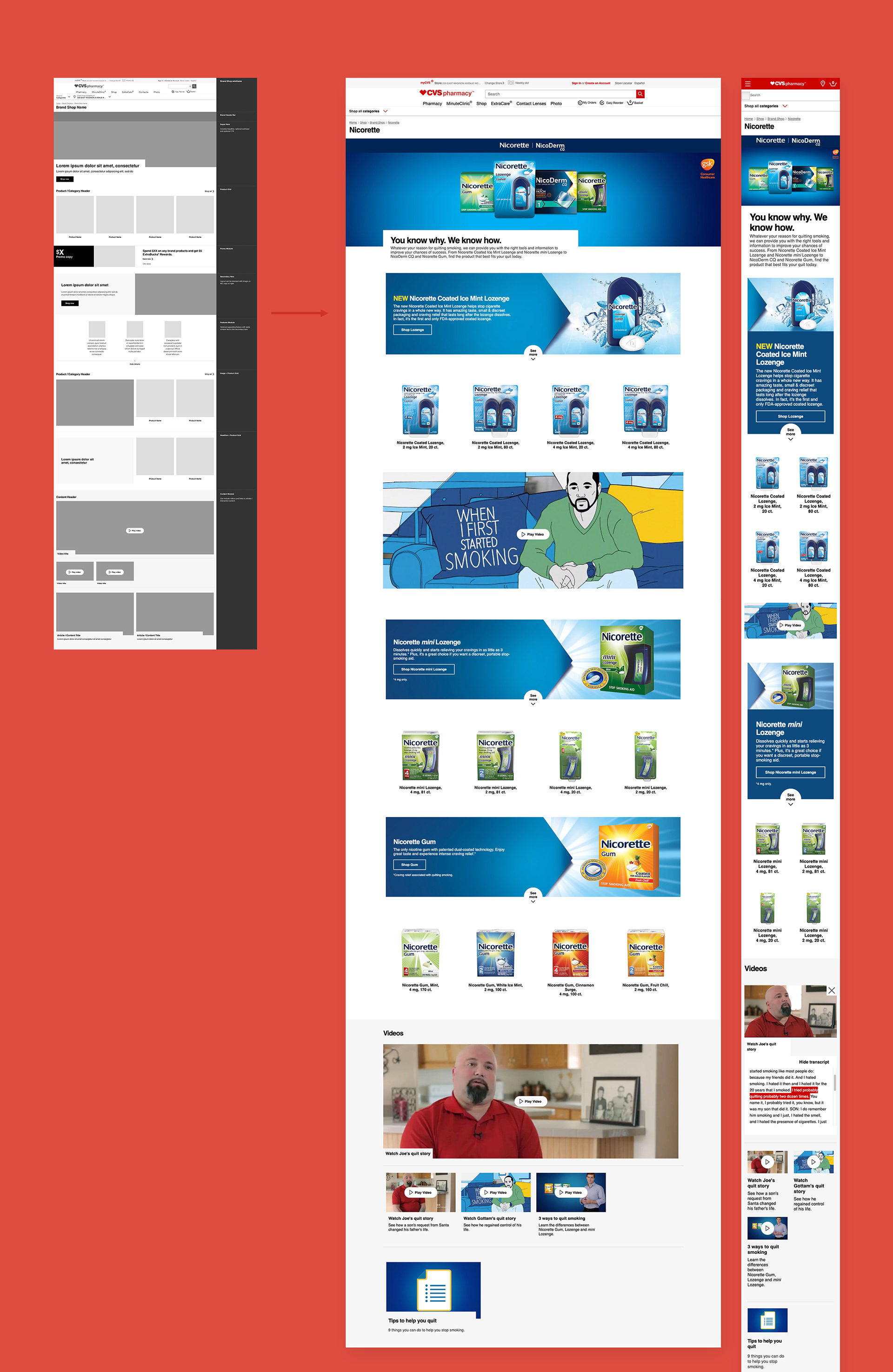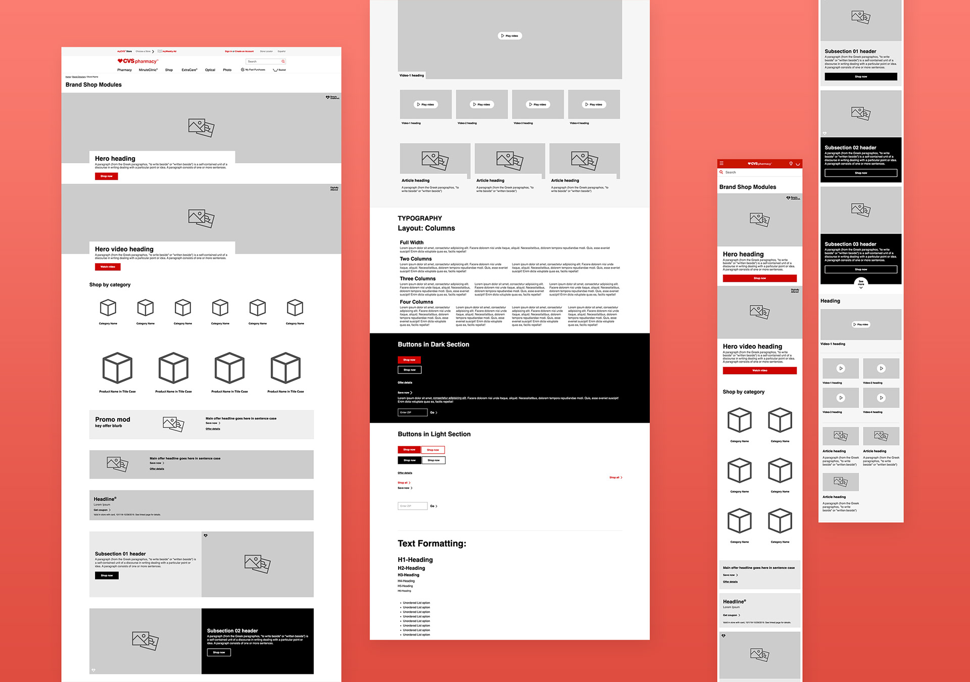 After aligning with CVS on requirements, I partnered with our developer and designers to create a flexible brand shop design pattern library, complete with HTML/CSS and Sketch components, for creating optimized, responsive pages with minimal effort and coding required, at scale.