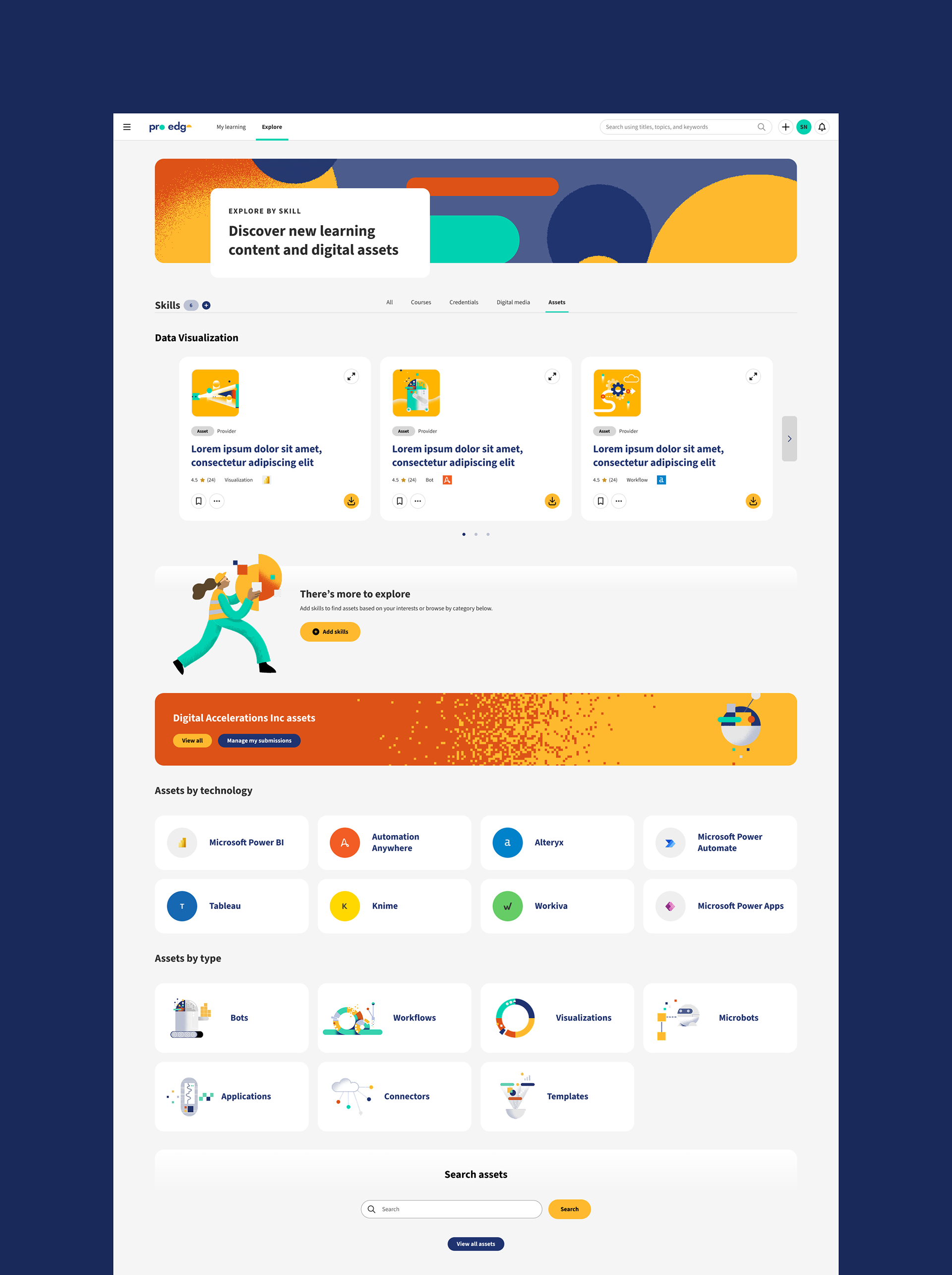 The redesign was a complete overhaul involving new information architecture and features, launched and enhanced in multiple phases. Starting with a skill-based experience that allowed users to explore learning based on their interests and usage history, and following with search functionality, we moved on to providing a more personalized homepage, profile, and assigned learning space to allow quick access to key content and ability to track progress.