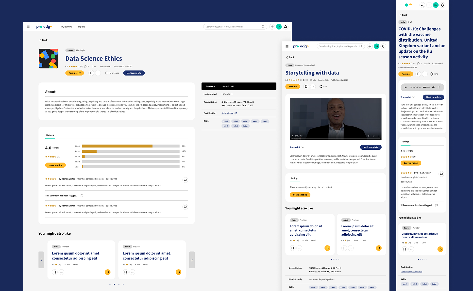 My job was to help stand up and deliver the product redesign in alignment with the brand vision as quickly as possible. As our team grew, I led the learner experience design strategy and delivery, onboarded new designers and provided direction for a design system spanning across the ProEdge Learn and Plan (admin experience) platforms.